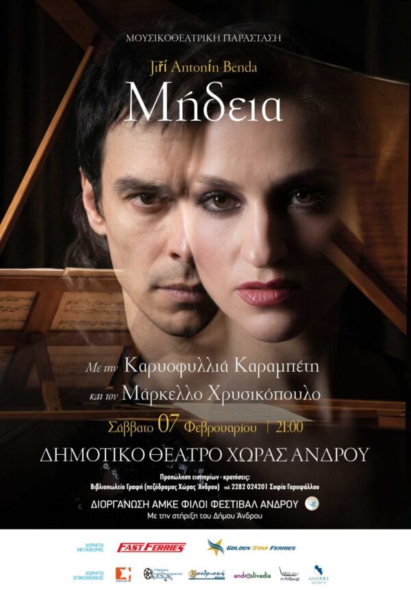Η κορυφαία ηθοποιός Καρυοφυλλιά Καραμπέτη και ο μαέστρος Μάρκελλος Χρυσικόπουλος έρχονται στην Άνδρο για μόνο παράσταση, για να ερμηνεύσουν το έργο του Τσέχου συνθέτη Jiří Antonín Benda (1722 – 1795) «Μήδεια», σε λιμπρέτο του Γερμανού ποιητή και θεατρικού συγγραφέα Friedrich Wilhelm Gotter και μετάφραση του Γιάννη Καλλιφατίδη, το Σάββατο 7 Φεβρουαρίου 2026, στις 21.00, στο Δημοτικό Θέατρο Χώρας.