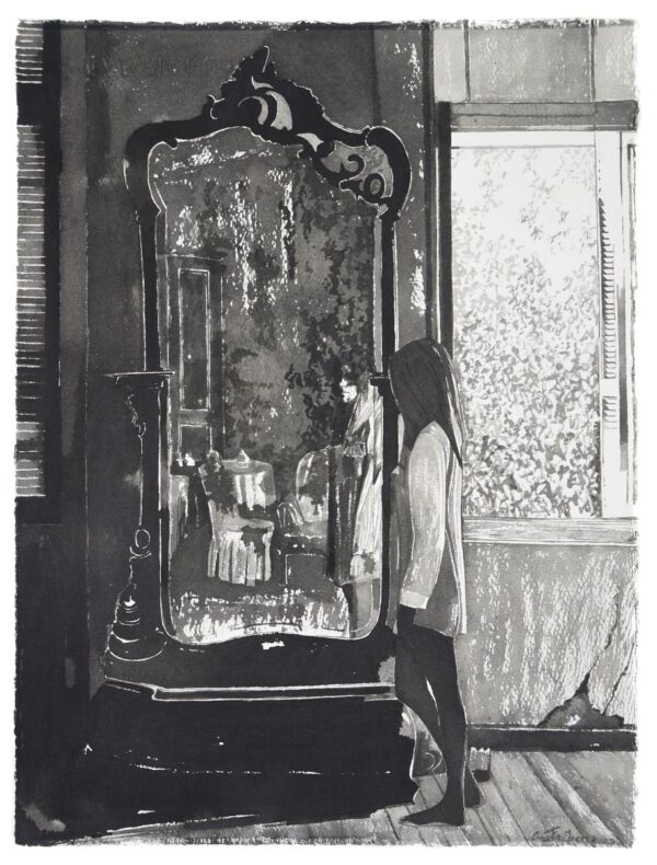 Γ.Σ. Δεν είχα υπ΄όψιν μου αυτό το έργο του Μαγκρίτ. Αλλά, όσο τρελό και αν ακούγεται, είχα σκεφτεί κάποια στιγμή να κάνω μιαν ακουαρέλα της κοπέλας που να βλέπει την πλάτη της στον καθρέφτη. Αυτό που όμως ήθελα πιο πολύ είναι να δει τον εαυτό της όπως τον βλέπω εγώ, όχι κάτι άλλο. Το αληθινό πρόσωπο, ο πραγματικός εαυτός ενός ανθρώπου δεν μπορεί να αναπαραχθεί. Αντίθετα αποκαλύπτεται και με μια του κίνηση.