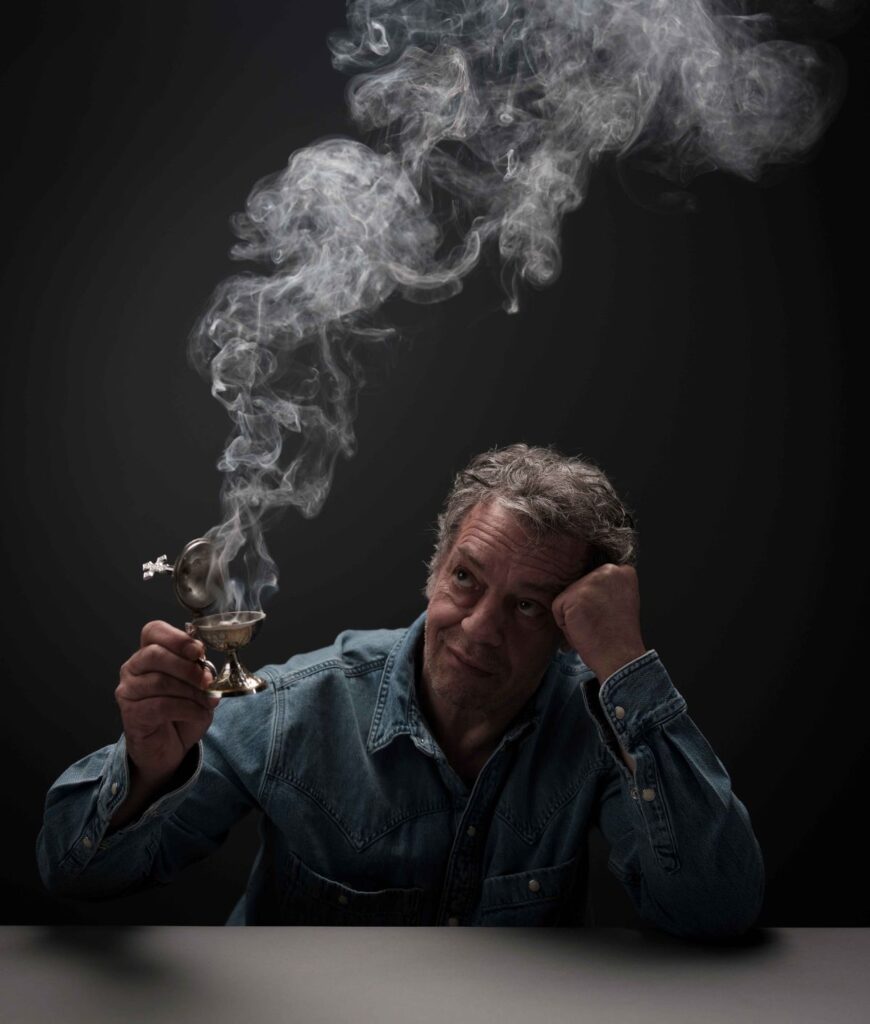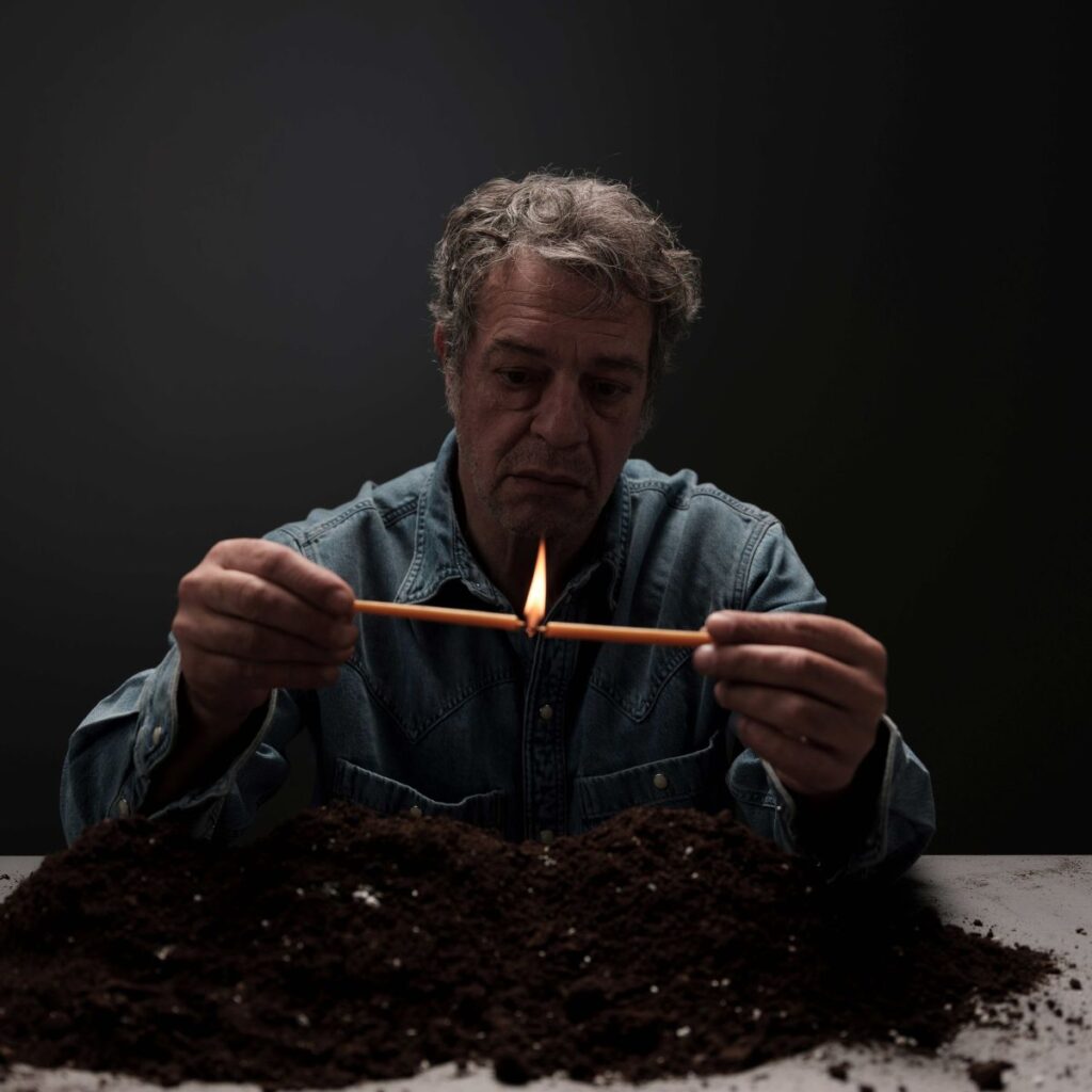 Η σκηνοθεσία της Έλενας Μαυρίδου –τοποθετημένη σε ένα αφαιρετικό τοπίο αποσύνθεσης, χωματερής αλλά και τόπου λήθης, «απόρριψης» σαρκίων –ακολουθεί μια πορεία κορύφωσης. Από την κατάσταση βραδύτητας και το τελετουργικό πένθος ο ήρωας, μέσω των στοχασμών του παρελθόντος, κατευθύνεται σε μια παραληρηματική εξιλέωση. Όρθιος πάνω από τον ανοιχτό λάκκο του θανάτου, οι αναμνήσεις της ζωής του ζωντανεύουν: θραύσματα εικόνων, σκιές ανθρώπων, στιγμές που ανασκάπτονται μέσα από το χώμα. Παράλληλα, το μουσικό οργανικό πλαίσιο του Γιώργου Μαυρίδη, συνοδεύει με αρχέτυπα ακούσματα της απώλειας μέσα στο απόκοσμο σκηνικό τόπο φθαρτότητας του Πάρι Μέξη. Ο Γιάννης Τσορτέκης ενδύεται τα πάθη του ήρωα και επιχειρεί μια διαδρομή μνήμης και αποκατάστασης, εξαγνισμού.