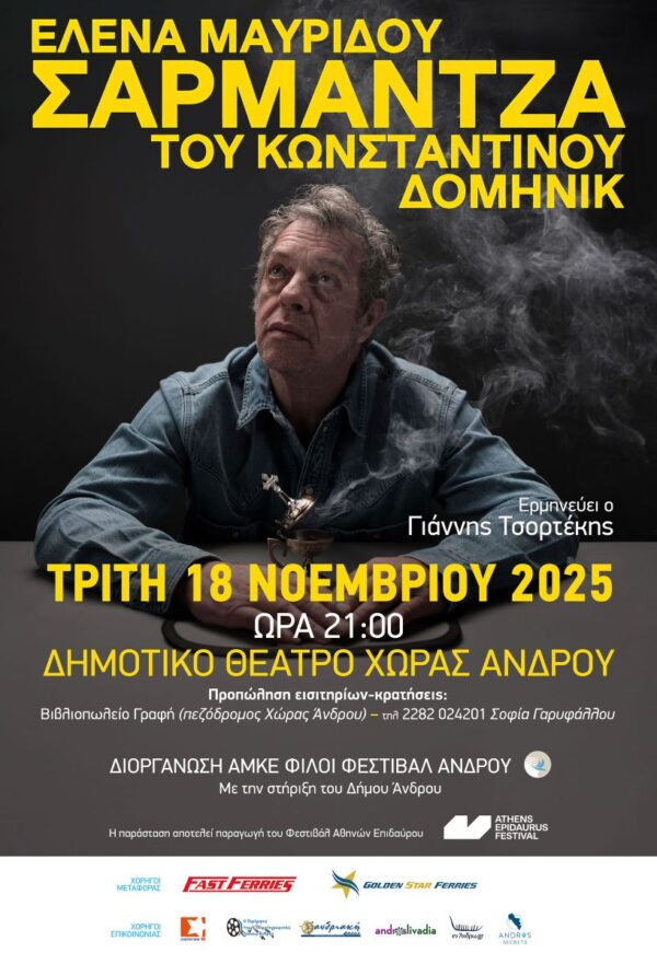 Μετά τις παραστάσεις στο Φεστιβάλ Αθηνών,  η «Σαρμάντζα» του Κωνσταντίνου Δομηνίκ  σε σκηνοθεσία Ελένας Μαυρίδου, με τον Γιάννη Τσορτέκη, έρχεται στην Άνδρο για μία μόνο παράσταση, την Τρίτη 18 Νοεμβρίου 2025, στις 21.00, στο Δημοτικό Θέατρο της Χώρας Άνδρου.